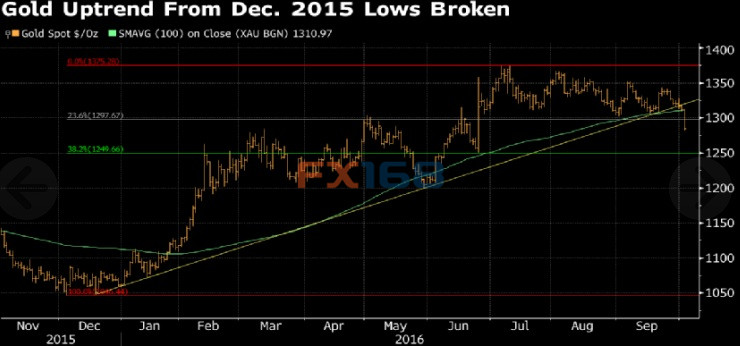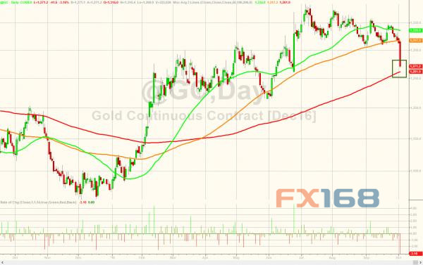 摘要: FX168財經(jīng)報社(香港)訊貴金屬市場成為周二金融市場上的焦點。金價周二重挫逾3%,觸及6月英國脫歐公投以來最低,創(chuàng)近15個月來最大單日跌幅,在紐約時段,金價跌破9月低點1,306.20和心理關(guān)口1,