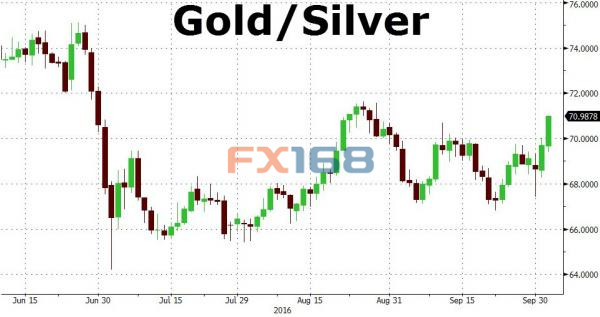 盡管金價重挫,但由于白銀跌勢更加駭人,這也幫助黃金/白銀比回升至71附近。