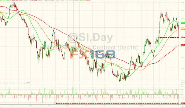 然而,相比黃金,白銀跌勢更加慘重。現(xiàn)貨銀周二崩跌5.1%,報17.78美元/盎司。銀價創(chuàng)下2015年1月以來最大單日跌幅: