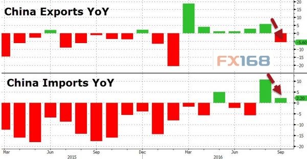 中國9月進(jìn)口同比(按人民幣計(jì))2.2%,預(yù)期5.5%,前值10.8%;