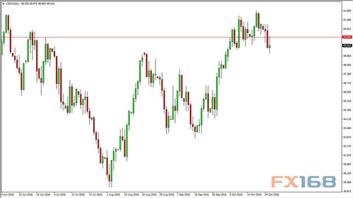 上一交易日,美國WTI原油價格來回波動,表明50美元/桶上方存在阻力,但也表明49美元/桶上方存在支撐。如周四美油跌破蠟燭圖底部,油價料將進(jìn)一步走低。屆時料將跌向47美元/桶水平,此處料存在支撐。相反方向,如突破射擊之星頂部尤其是突破50美元/桶關(guān)口水平,那么油價將再次升向52美元/桶水平。最終,無論如何,油價走勢將非常震蕩。