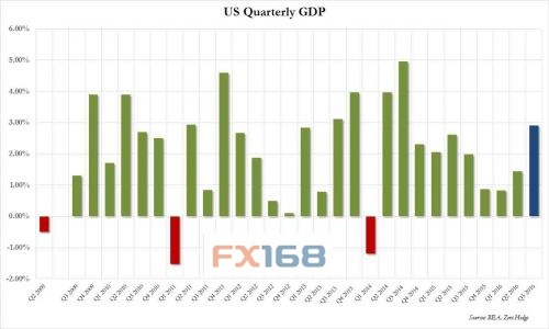 根據今天報告,美國三季度GDP初值增速,不僅僅是二季度的兩倍至多,而且還創(chuàng)下了2014年三季度以來最為強勁的增速。