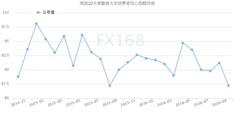 密歇根大學周五公布的數據顯示,美國10月密歇根大學消費者信心指數終值實際為87.2,預期為88.1,前值為87.9