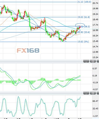 技術(shù)面上看,日線級(jí)別上,隔夜銀價(jià)再創(chuàng)近三個(gè)月新高,逼近200日均線17.90美元水平。指標(biāo)上,MACD紅色動(dòng)能柱持平,雙線金叉,KDJ指標(biāo)向上,但在收復(fù)200日均線前,中期風(fēng)險(xiǎn)仍偏中性。4H級(jí)別上,短期銀價(jià)上行趨勢(shì)不變,若后市突破200日均線,則將逆轉(zhuǎn)此前的中期下行趨勢(shì)。