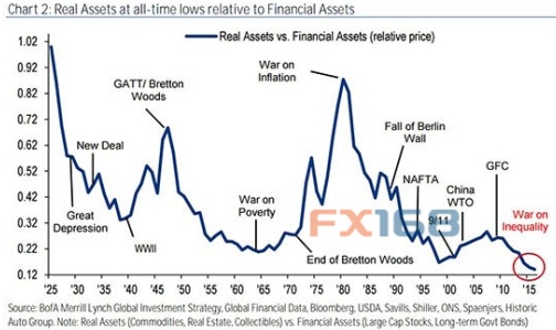 (實(shí)體資產(chǎn)與金融資產(chǎn)相對價(jià)格 來源:美銀美林、FX168財(cái)經(jīng)網(wǎng))