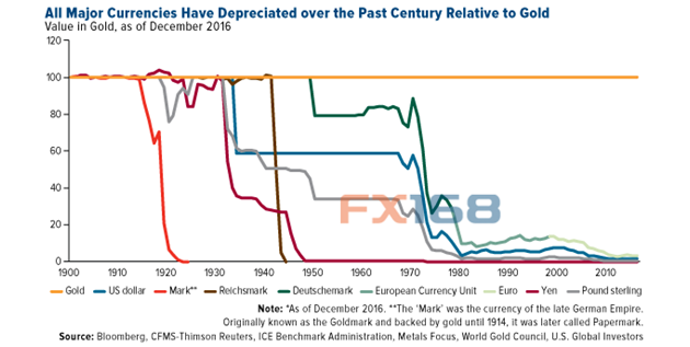 隨著央行不斷開動(dòng)印鈔機(jī),事實(shí)上,在過去一個(gè)世紀(jì)中,所有主要貨幣相對于黃金都呈現(xiàn)貶值態(tài)勢。