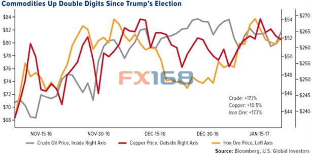 自美國總統(tǒng)大選以來,銅、鐵礦石和原油均上漲。在美國大選日和就職典禮日期間,上述三種資產(chǎn)均收獲兩位數(shù)增幅。