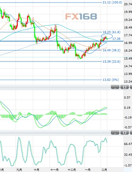 目前銀價的初步阻力位于17.87/91美元,進一步阻力在18、18.27、18.75以及19美元。下行方面,初步支撐在17.55以及17.40美元,進一步支撐在17.26、17.05/17、16.63、16.50、16.25、16、15.84/80、15.63、15.40以及15美元。