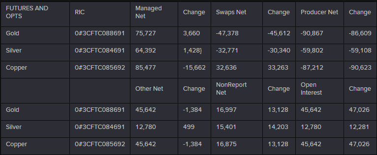 投機(jī)客還增持了白銀凈多頭頭頭寸,但減持了銅凈多頭頭寸。