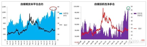 當前白銀期貨未平倉合約達到紀錄高位的22.8萬手,相當于11.4億盎司白銀。這個數(shù)字相當龐大,因為全球每年白銀產(chǎn)量才大約為9億盎司左右。另外,雖然白銀凈多倉下滑,但投機性凈多倉總計10.3萬手,達到歷史極端水平,這是值得投資者警惕的信號。