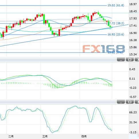 技術(shù)面上看,日線級(jí)別上,隔夜銀價(jià)進(jìn)一步下跌,并下探100日均線17.37美元,該位置同時(shí)還是去年12月以來的漲勢(shì)的趨勢(shì)支撐。指標(biāo)上,MACD綠色動(dòng)能柱擴(kuò)大,雙線死叉向下,KDJ指標(biāo)向下,中期風(fēng)險(xiǎn)轉(zhuǎn)為下行。4H級(jí)別上,短期銀價(jià)的下行風(fēng)險(xiǎn)加劇,若跌破17.35美元水平,可能打開進(jìn)一步下跌的空間。