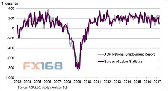 (ADP與非農(nóng)就業(yè)數(shù)據(jù)走勢(shì)圖 來(lái)源:FX168財(cái)經(jīng)網(wǎng)、美國(guó)勞工部、數(shù)據(jù)處理公司ADP)