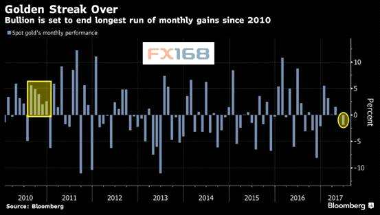據(jù)彭博,現(xiàn)貨黃金勢將創(chuàng)下去年12月以來首個月度跌幅,終結(jié)自2010年以來最長的月度連漲周期。