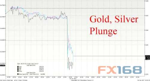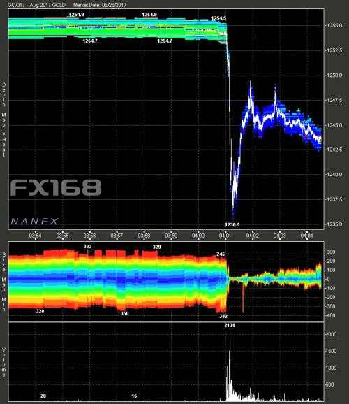 北京時間周一下午16:01,現(xiàn)貨黃金突破急跌18美元或1.6%,至六周低位1236.46美元/盎司低位,因超過1.8萬手合約或逾20億美元名義價值的合約在短短幾秒鐘之內被成交。Comex在短短一分鐘內就成交了18149手合約,一個小時之后2334手。像往常一樣,黃金也拖累白銀價格一道暴跌,最低觸及16.26美元/盎司。