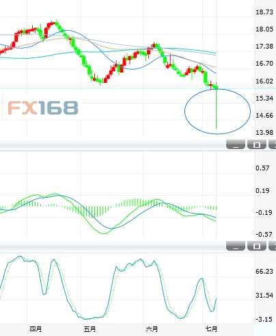 周四,銀價(jià)基本在15.90-16.10美元間窄幅整理,上方均線呈空頭排列,整體的下行趨勢不變。周五(7月6日)亞洲時(shí)段盤初,銀價(jià)一分鐘內(nèi)閃崩逾10美元,并觸及14.35美元的17個(gè)月低位,隨后迅速收復(fù)跌幅,暫交投在15.90美元/盎司附近。