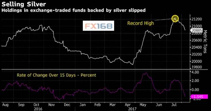 根據(jù)彭博匯編的數(shù)據(jù),白銀ETF持倉量自7月18日達到創(chuàng)紀錄水平以來已減少1.6%,合331噸,這個15天期間的降幅創(chuàng)下去年12月以來最快。