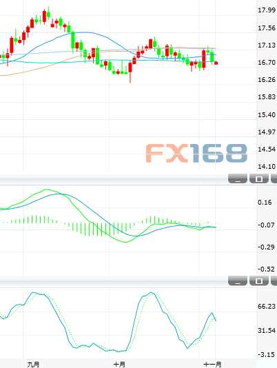 F 國(guó)際現(xiàn)貨白銀上周五(11月3日)大跌逾1.5%,并錄得帶上下影線的中陰線。銀價(jià)當(dāng)天最高觸及17.17美元/盎司,最低下探至16.76美元/盎司。