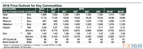 ?。P鍵商品2018年價格預期,來源:彭博、道明、FX168財經(jīng)網(wǎng))