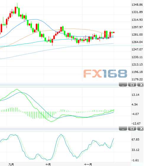 技術(shù)面上看,日線級別,隔夜金價繼續(xù)收在1290美元以及50日均線1284美元上方,但在突破10月16日高點(diǎn)1306美元之前,趨勢不會轉(zhuǎn)為上行。指標(biāo)上,MACD紅色動能柱略微擴(kuò)張,雙線金叉向上,KDJ指標(biāo)向上。鑒于金價仍收在200日均線1265美元以上,中期風(fēng)險仍偏上行。