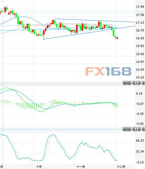 周四銀價連續(xù)第三個交易日下挫,并觸及近四個月新低。就目前來看,銀價中短期風險均偏向下行,若有效跌破10月6日低位16.30美元,則將看向16美元的整數(shù)關口。至于上行方面,在銀價未收在200日均線17.10美元前,短期的下行趨勢不會改變。