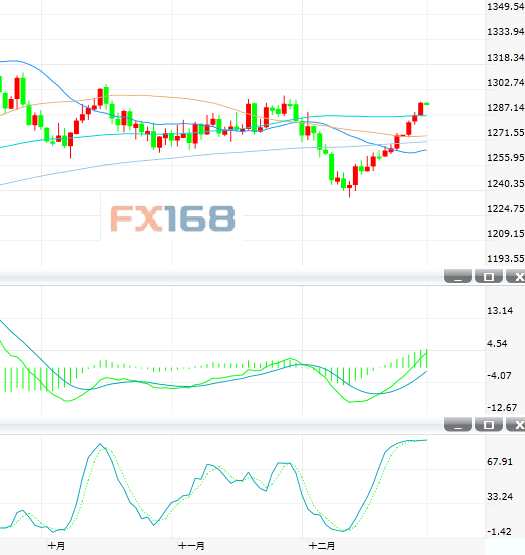 技術(shù)面上看,日線級別,隔夜金價進(jìn)一步攀升,并逼近1300美元關(guān)口,中短期風(fēng)險偏向上行。指標(biāo)上,MACD紅色動能柱擴張,雙線金叉向上,KDJ指標(biāo)向上。