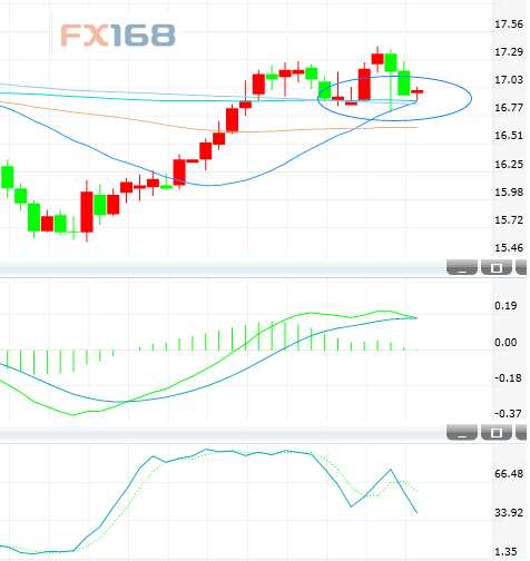 技術(shù)面上看,日線級別上,隔夜銀價下挫,且再度考驗(yàn)200日均線16.90美元水平。指標(biāo)上,MACD紅色動能柱繼續(xù)收縮,雙線存在死叉風(fēng)險,KDJ指標(biāo)向下。