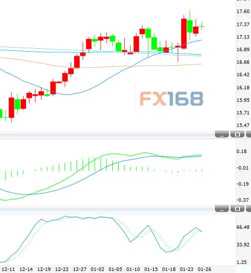 摘要: FX168財經(jīng)報社(香港)訊國際現(xiàn)貨白銀上周五(1月26日)小幅上漲,并錄得帶較長上影線的小陽線。銀價當天最高觸及17.53美元/盎司,最低下探至17.22美元/盎司。上周五銀價反彈,下方20日均線1