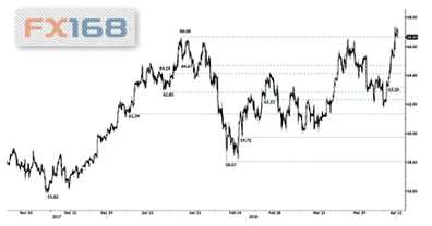 短線:日線級別,價格昨日收出3連陽,日內(nèi)最高觸及67.45水平,升破此前66.66高點位置,今日迄今雖然價格略向下回調(diào),但仍基本企穩(wěn)于66.66上方位置。由此看,此前的交易區(qū)間及阻力位已經(jīng)有突破,且2017年11月開啟的上行走勢再被確認(rèn),后一目標(biāo)位看向69.54水平,即2014年12月1日高點。