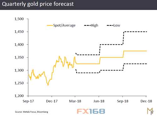 今年早些時候,湯森路透黃金礦業(yè)公司(GFMS)預(yù)測,2018年金價均價將為1360美元/盎司,峰值為1500美元/盎司。