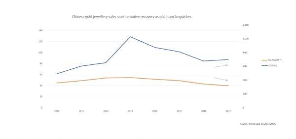 在經(jīng)歷了多年的下滑后,中國黃金珠寶銷量終于開始回暖,但消費者仍然對鉑金沒有太大興趣。