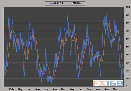 自2015年12月以來,黃金每日情緒指數(shù)預(yù)測到了黃金的每一個低谷和峰值。其目前交投于21日移動均線下方,意味著反彈即將到來。