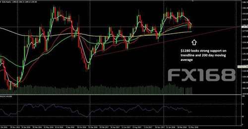 周線圖上,黃金在該趨勢線即1280美元附近以及200日均線受到主要支撐。