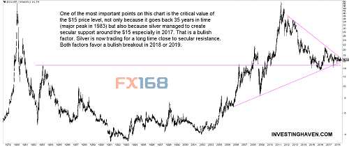 該機(jī)構(gòu)指出,對于白銀而言,我們認(rèn)為該點(diǎn)則是15美元的水平。上圖顯示出15美元支撐對銀價(jià)的重要性。這一水平也代表了一種長期的支持,這證實(shí)我們對2018年白銀的樂觀前景。