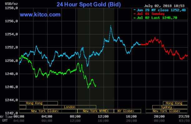 F 現(xiàn)貨黃金周一(7月2日)下挫,美市盤中最低下探至1245.55美元/盎司,觸及一年低位,金價(jià)運(yùn)行在1250關(guān)口下方,繼續(xù)處于弱勢之中。美元周一止跌反彈,強(qiáng)勢上漲,美元指數(shù)重返95關(guān)口上方,繼續(xù)對黃金施壓。