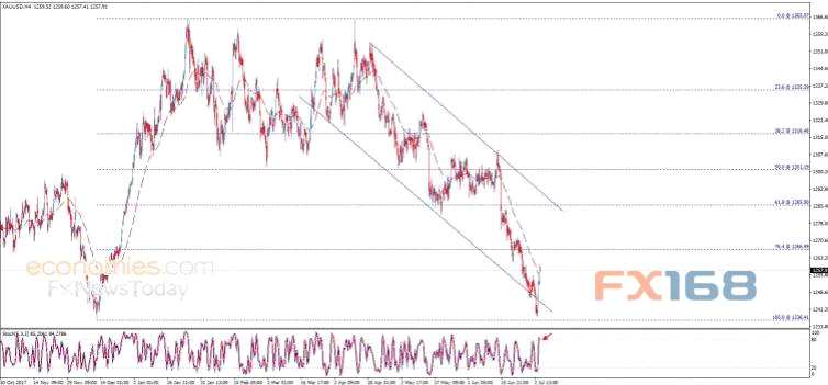 F 資訊網(wǎng)站Economies.com在周三(7月4日)發(fā)布的報(bào)告中稱,黃金在跨越了50日均線后保持了積極交易的態(tài)勢(shì),有可能測(cè)試關(guān)鍵阻力位1267.00美元/盎司,但需要注意的是隨機(jī)波動(dòng)逐漸喪失上漲動(dòng)能,金價(jià)有可能再次下跌,重會(huì)跌勢(shì)。