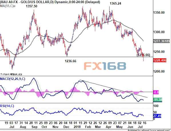 F 資訊網(wǎng)站actionforex在周二(7月17日)發(fā)布的報(bào)告中表示,今日黃金強(qiáng)勁下破1236.66后證實(shí)了,金價(jià)在經(jīng)歷從1365.24整體下跌后的反彈相當(dāng)令人失望。這還證實(shí)了中期從1122.81升至1365.24已經(jīng)完成了。