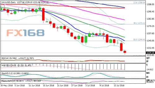 F 現(xiàn)貨金周三(7月18日)跌至一年新低1221美元/盎司,延續(xù)了此前一天的強(qiáng)勁跌勢(shì)。此前,美聯(lián)儲(chǔ)的鷹派基調(diào)提振了美元。