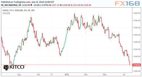 由于投資者繼續(xù)涌入美元,黃金價格周四(7月19日)接近12個月新低。8月黃金期貨價格交投于1217.90美元/盎司,當日下跌近1%。在過去的三個月里,黃金價格已經下跌了近10%。與此同時,在同一時期,美元指數上漲了7%,創(chuàng)下一年新高95.65。