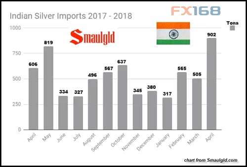 從圖上可以看到,自從去年以來,印度4月白銀進口達到創(chuàng)紀錄的902噸。