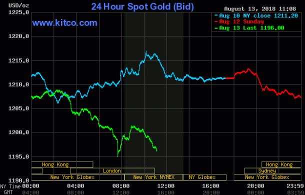 F 現(xiàn)貨黃金周一(8月13日)迎來大跌,美市盤中最低下探至1194.61美元/盎司,金價已下破1200大關,觸及一年半低位,盤中現(xiàn)跳水行情,金價直線墜落,期間雖有反彈,但無果而終,空頭仍占據上風。白銀周一則觸及兩年低位,最低下探至15.05美元/盎司。美元周一也停止上漲,小幅下跌,但美元指數(shù)仍運行在96關口上方。