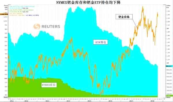 鈀金庫(kù)存下降便是支撐他們這種看法的依據(jù)。紐約商業(yè)期貨交易所(NYMEX)鈀金庫(kù)存為48,465盎司,接近2003年以來(lái)最低。鈀金上市交易基金(ETF)持倉(cāng)已從2015年的260萬(wàn)盎司降至不到100萬(wàn)盎司。