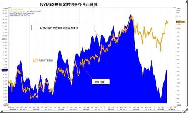 紐約商業(yè)期貨交易所(NYMEX)投機(jī)客鈀金凈多倉(cāng)在1月時(shí)為27000多口,相當(dāng)于逾270萬(wàn)盎司,到8月時(shí)已銳減至110,400盎司,之后稍見反彈至略多于100萬(wàn)盎司。