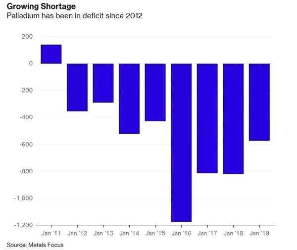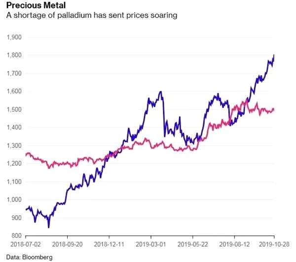鈀金是鉑金或鎳礦開(kāi)采的副產(chǎn)品,其產(chǎn)量往往滯后于價(jià)格上漲。事實(shí)上,預(yù)計(jì)2019年的產(chǎn)量將連續(xù)第八年低于需求。這推動(dòng)鈀金價(jià)格屢創(chuàng)新高。道明證券大宗商品策略師Ryan McKay表示:“鈀金市場(chǎng)的供應(yīng)緊張仍是(價(jià)格上漲)主要推動(dòng)力。市場(chǎng)對(duì)工業(yè)金屬的看法也比較樂(lè)觀,這也有利于鈀金?!苯衲甏蟛糠謺r(shí)間鈀金的交易價(jià)格都高于黃金。
