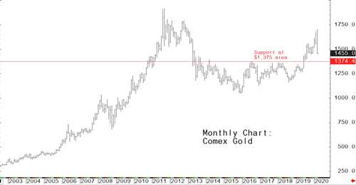 Wyckoff指出,從紐約商品期貨交易所(Comex)黃金期貨的月度延續(xù)圖上可以看出,3月份的價(jià)格出現(xiàn)了罕見的技術(shù)上看空的“月線外包”式下跌,即3月份的交投區(qū)間超過(guò)了2月份的交投區(qū)間。黃金期貨的下一個(gè)較長(zhǎng)期技術(shù)支撐區(qū)域是1375美元。如跌至這一水平下方,1250美元區(qū)域?qū)⒆鳛殚L(zhǎng)期圖表支撐。此外,在2015年低點(diǎn)1046.00美元附近有堅(jiān)實(shí)的長(zhǎng)期圖表支撐。