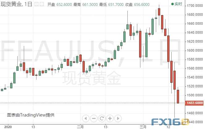 盡管美聯(lián)儲采取了進(jìn)一步的緊急措施,但市場情緒依然惡化,周一盤中金價一度較日高大跌逾120美元,跌破1500美元/盎司,觸及1451.10美元/盎司低點,跌幅達(dá)5.1%。