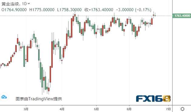 現(xiàn)貨黃金周一盤中最高上漲至1763.00美元/盎司,距離上月觸及的七年半高位1764.55美元/盎司咫尺之遙,收于1754.81美元/盎司,上漲11.97美元或0.69%。