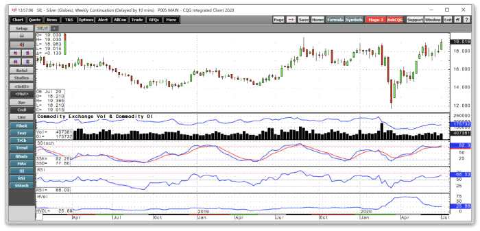 上周末,9月到期的白銀期貨收于19.053美元/盎司。價(jià)格動(dòng)能和相對(duì)強(qiáng)度指標(biāo)均上漲,并在日線圖上趨向超賣區(qū)域。COMEX白銀期貨市場(chǎng)未平倉(cāng)多頭倉(cāng)位總數(shù)上漲至175,732,這是白銀期貨市場(chǎng)看漲價(jià)格走勢(shì)的建設(shè)性信號(hào)。同時(shí),每日歷史波動(dòng)率從3月的100%以上下降到7月10日的22.2%。價(jià)格方差返回到接近長(zhǎng)期平均值的水平。事實(shí)證明,第一季度的低點(diǎn)開(kāi)啟了第二季度和第三季度初白銀的上漲趨勢(shì)。