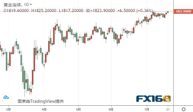 摘要: F周二(7月21日)歐市早盤,現(xiàn)貨黃金維持升勢(shì),現(xiàn)報(bào)1822美元/盎司左右。黃金期貨位于1824美元/盎司附近。
