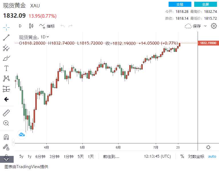 F 周二(7月21日)歐市盤中,市場風(fēng)險情緒爆發(fā),股市、原油等資產(chǎn)全線爆發(fā),尤其是金銀油罕見同時大漲:現(xiàn)貨黃金站上1830美元/盎司,續(xù)刷2011年9月以來新高。COMEX黃金期貨站上1830美元/盎司,為2011年9月以來首次。