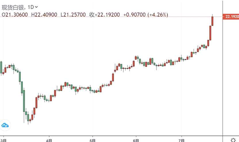 F 周三(7月22日)亞市早盤,貴金屬市場再現驚天暴漲,白銀早盤飆升5%至22美元上方。